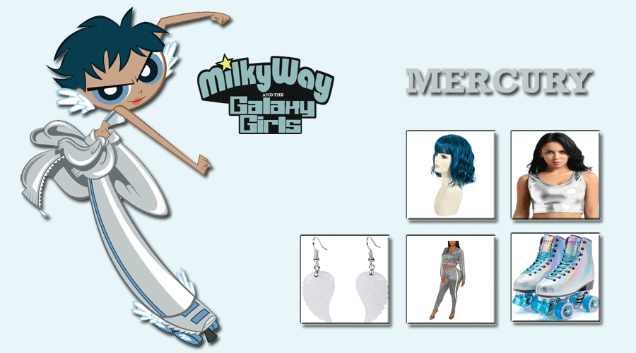 A cartoon concept in Milky Way and the Galaxy Girls; pitched to Hasbro by Lauren Faust. However, Hasbro passed on it, it eventually morphed into the highly successful My Little Pony: Friendship is Magic. MWGG is inspired by the 90’s Strawberry Shortcake series; with a dash of the anime Sailor Moon, with the girls as the personification of different planets. Mercury’s winged sneaker skates propel her through the cosmos in a shimmery silver flash at the speed of light. Collect all the accessories of Mercury costume from Milky Way and the Galaxy Girls for Halloween and cosplay.