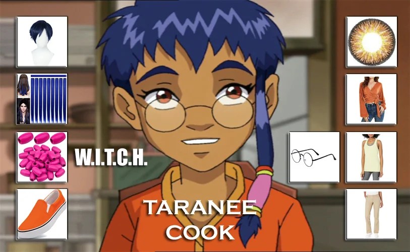 In the Comic Book/Cartoon Series W.I.T.C.H.; Taranee (voiced by Miss Kittie) is one of the main characters. She is the one with the firepower among the W.I.T.C.H. guardian. Cook can form it into shapes of flame while attacking. She has short, spiky dark blue hair worn in one long strand down the side of her face, tied off with a beaded cuff, and brownish orange eyes. Taranee originally wear an orange and yellow tied shirt with a pale greenish-yellow undershirt below it, khaki pants, and a pair of shoes that match her overshirt. She wears a pair of large-rimmed circular glasses. Collect all the accessories of Taranee Cook costume from W.I.T.C.H. for Halloween and cosplay.