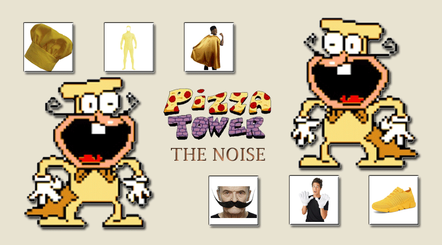 In the 2D Pizza Tower game, Theodore Noise is a character. He is a playable character in the game and Peppino Spaghtti’s rival. The Noise outfit contains a yellow suit, and mask with a darker cape, reminiscent of The Noid from Domino’s Pizza’s 1980s ad campaign. The Noise has a curled mustache and wears white gloves. To recreate this look, start with a pale yellow bodysuit and a gold cape. Add cartoon Mickey gloves, a chef’s hat, yellow shoes, and an oversized mustache to finish your costume. Collect all the accessories of The Noise costume from Pizza Tower for Halloween cosplay.