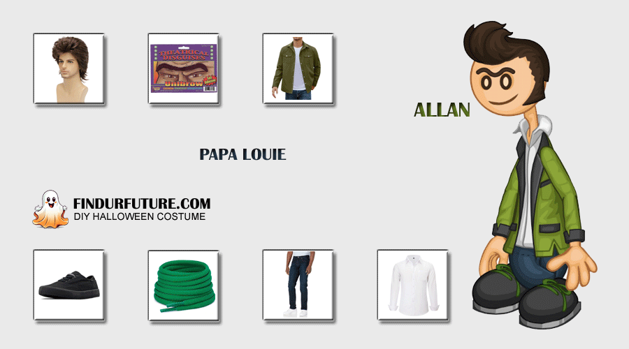Allan is one of the fun characters from the Papa Louie game world. He first appears as a customer at Papa’s Pizzeria but later becomes a worker at Papa’s Mocharia. In order to stand out, he’s shown as a hockey player with brown hair, a strong unibrow, and even a missing tooth. Sometimes, he also has a black eye, showing the tough side of sports. His outfit includes a white shirt, green jacket, dark jeans, and sneakers with green laces. Furthermore, Allan enjoys hanging out with pals, eating burgers and sundaes, and playing cool math games at the arcade. On a new level, he shows prudence when handling customers and closers from the menu. Jojo, Boopsy, and others find his DIY style with a bag of tricks pretty unique. Collect all the accessories of Allan from Papa Louis costume for Halloween and cosplay.